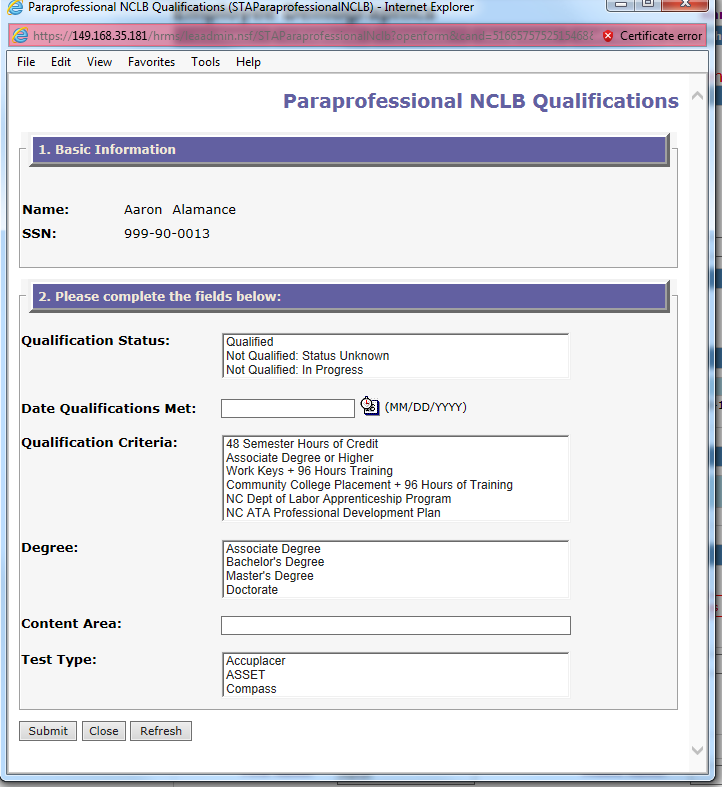 - Date Qualifications Met: Enter date NCLB Qualifications were met.