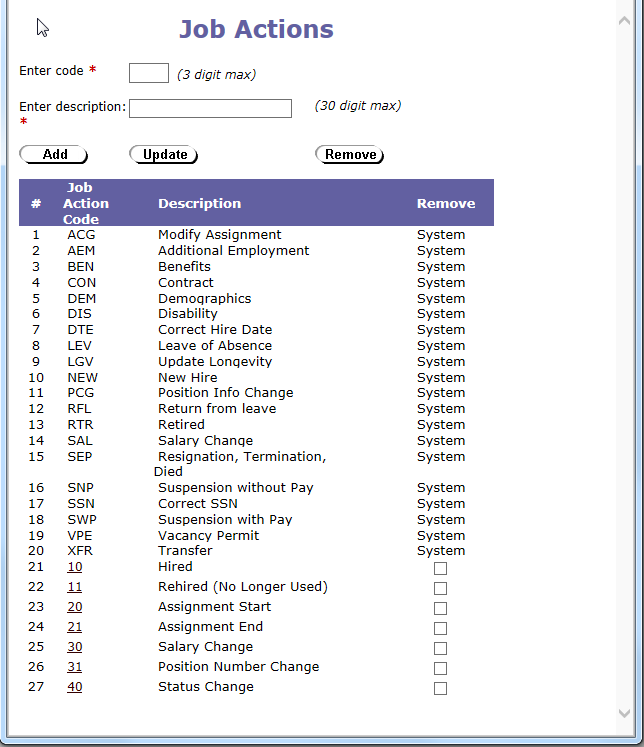 When viewing all the Job Actions on the configuration screen, you will see many "System" codes. These "System" codes are not available from the Employee Page/Other/Job Action option since these are automatically recorded by the system while processing staff. Please note that most of these "System" job actions became obsolete with the implementation of the HRMS
