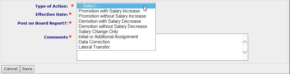 - Comments (required if Type of Action is 'Promotion', 'Demotion', or 'Salary Change Only')