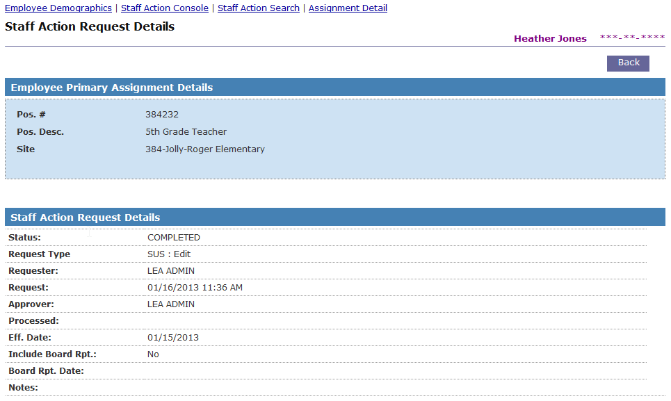 Staff Action Request Details form displays values of the suspension record